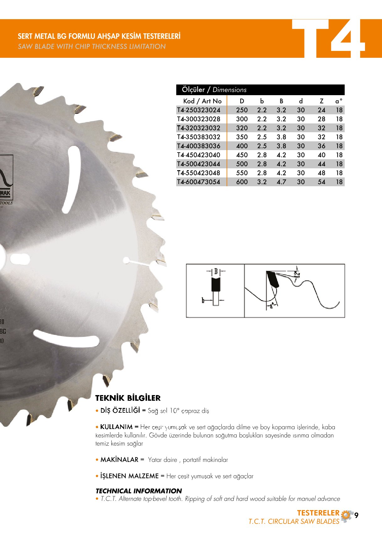 Her çeşit yumuşak ve sert ağaçlar. Sert metal BG formlu ahşap kesim testerelerimin çapı 250-600 mm ve göbek çapı 30 mm arasında değişik diş sayılarında firmamızda üretilmektedir. |